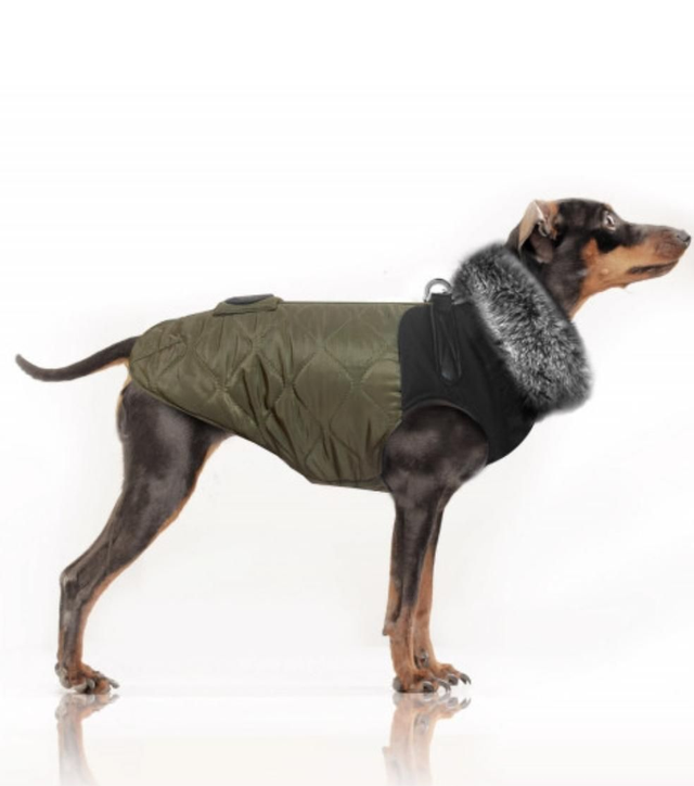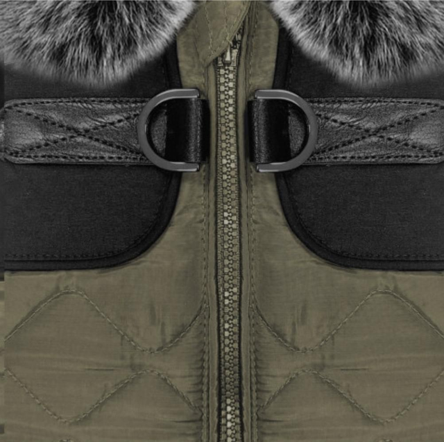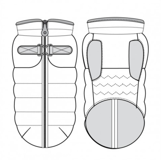 Wasserabweisender Harnessmantel mit abnehmbaren Kragen. Reisverschlussöffnung über die komplette Rückenlinie mit Schnallen für die Leine.