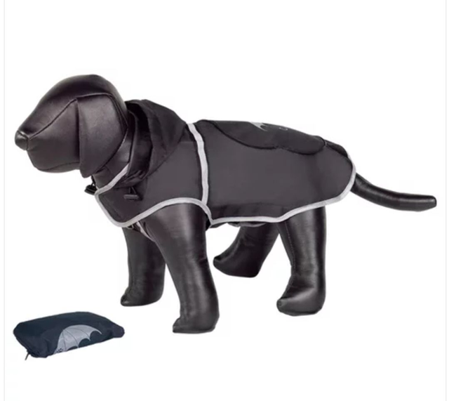 Der Hundemantel - Für die einen ist er ein modisches Accessoire, für die anderen ein Schutz vor Regen und Kälte. "Rainy" ist aus einer stark wind- und wasserabweisenden Kunstfaser hergestellt. Um "Rainy" unterwegs komfortabel mitzunehmen, ist er zusammenfaltbar. Die passende Tasche dazu ist im Lieferumfang enthalten. Der Klettverschluss ermöglicht ein unkompliziertes und schnelles An- und Ablegen des Mantels. Bei Gebrauch in der Dämmerung oder in der Nacht sorgen die Reflektorstreifen für zusätzliche Sicherheit.