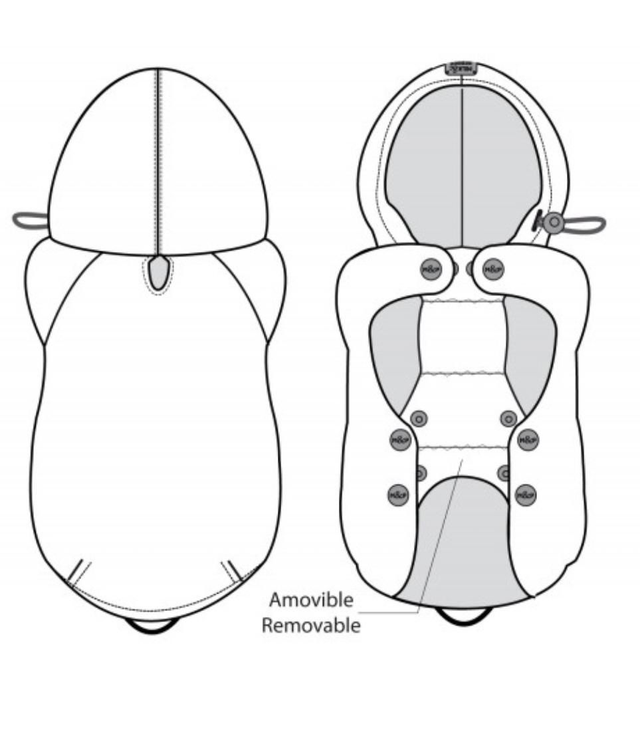 Ärmelloser wasserfester Regenmantel mit Kapuze. Öffnen/Schließen durch Druckknöpfe am Bauch. Einfache Druckknopfleiste bei den Größen 26 bis 32 , doppelte Druckknopfleiste bei den Größen 35 bis 45. Gefütterte Kapuze aus marineblauem Jersey. Gummizug für den Schwanz und Leinenloch oben auf der Rückseite.